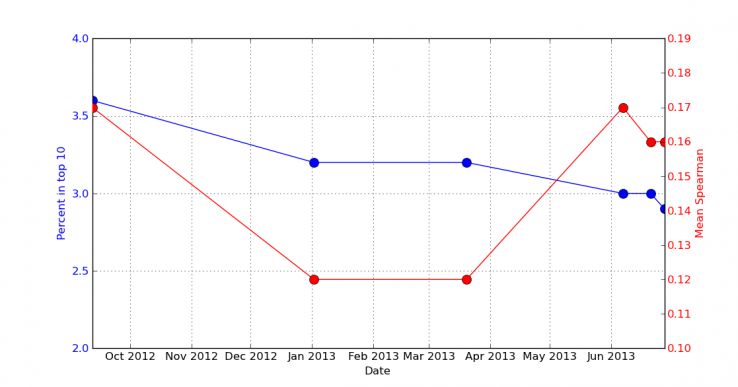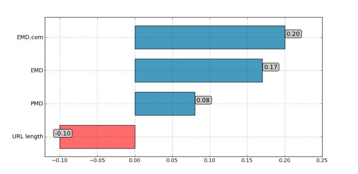 令人驚奇的是,排名首頁的EMD域名的比例逐年下降。從相關性來看,EMD是蹺蹺板形態,在13年的3月份又上升了。之前的下降應該是Google針對EMD的調整,而相關性的上升說明EMD在高排名的頁面中還是存在的,只是不再那么流行而已。