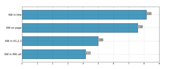 從詞頻得分和語言模式得分兩個方面測算文檔和關鍵詞的相關性,結果發現,標題標簽、Html內容、meta標簽、h1標簽都是高度相關的。