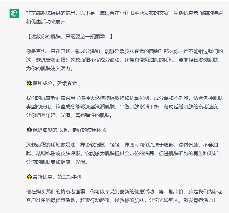 接著,小編讓ChatGPT為一款抗衰老面霜寫一篇文案,同時(shí)給到諸如“成分溫和、延緩皮膚衰老“等信息,并且要求ChatGPT結(jié)合小紅書的平臺特點(diǎn)。